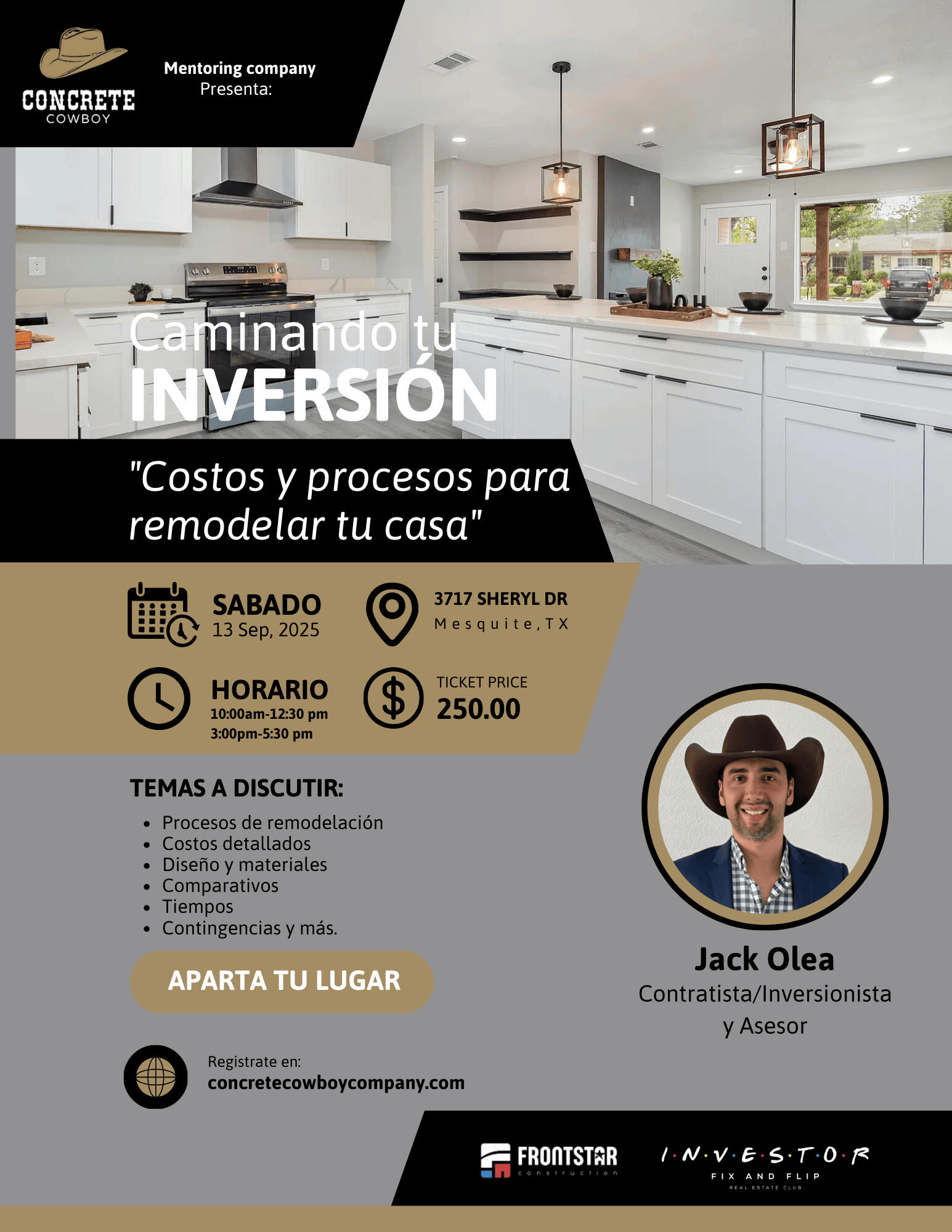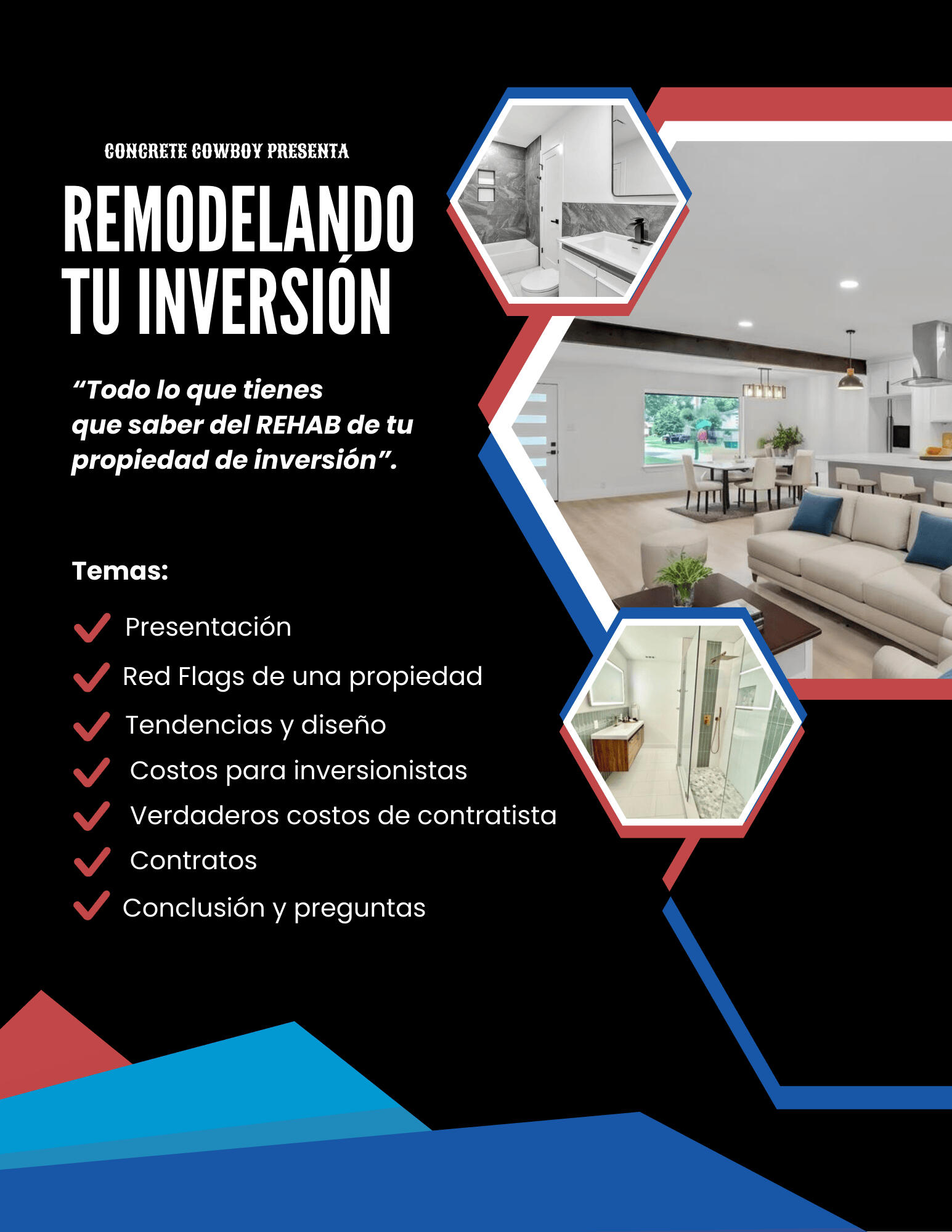 Este seminario-webinar esta dirigido especialmente para todos aquellos inversionistas en bienes raíces que quieran conocer a detalle todo el proceso para remodelar su propiedad de inversión, ya sea para un fix and flip o para renta. Desde los costos de materiales, mano de obra, códigos de construcción, diseño y cláusulas de contrato para una relación profesional, estable y duradera con tu contratista.